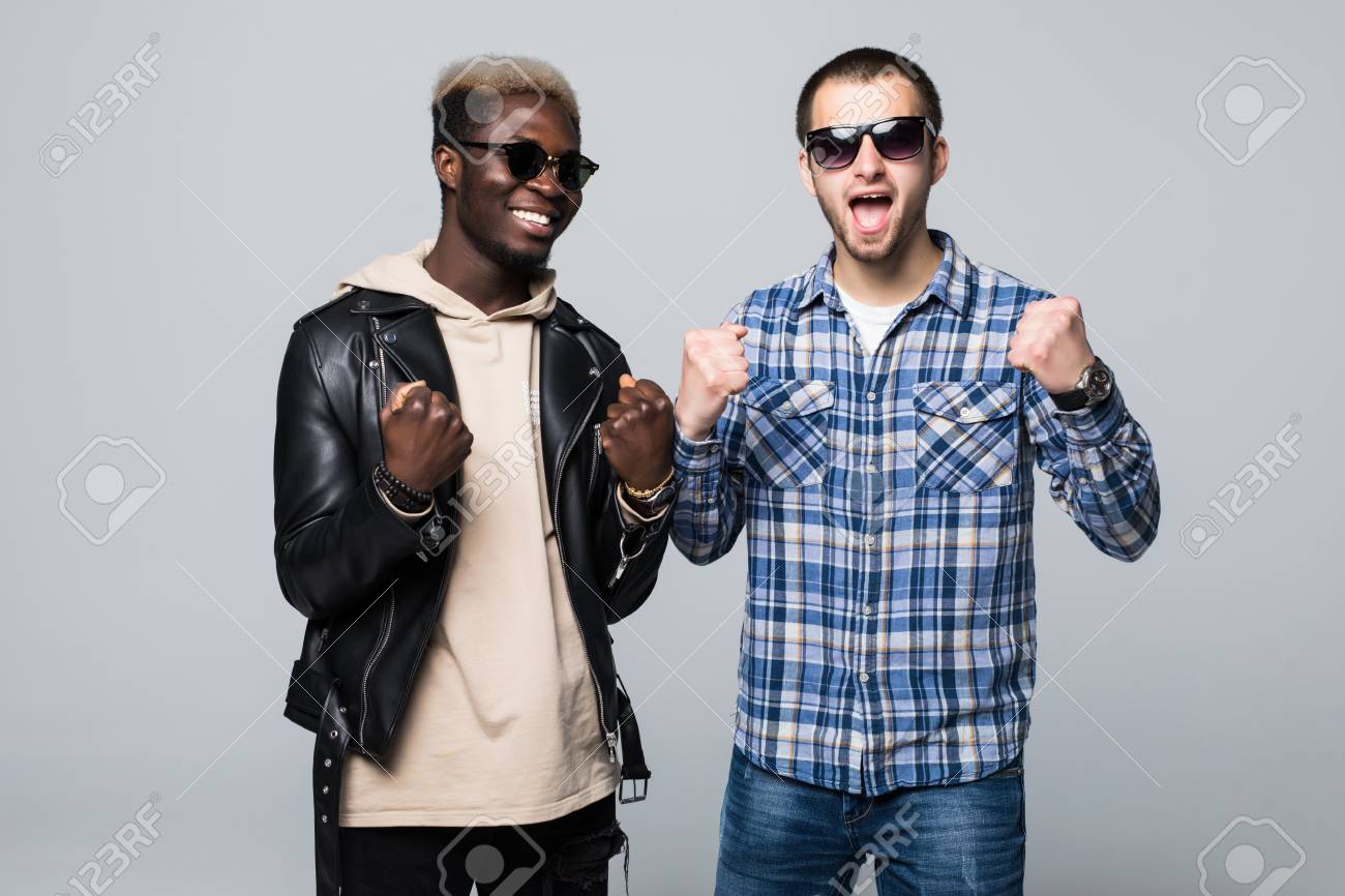 Two Young Successful Jumping In Joy Two Handsome Multiracial