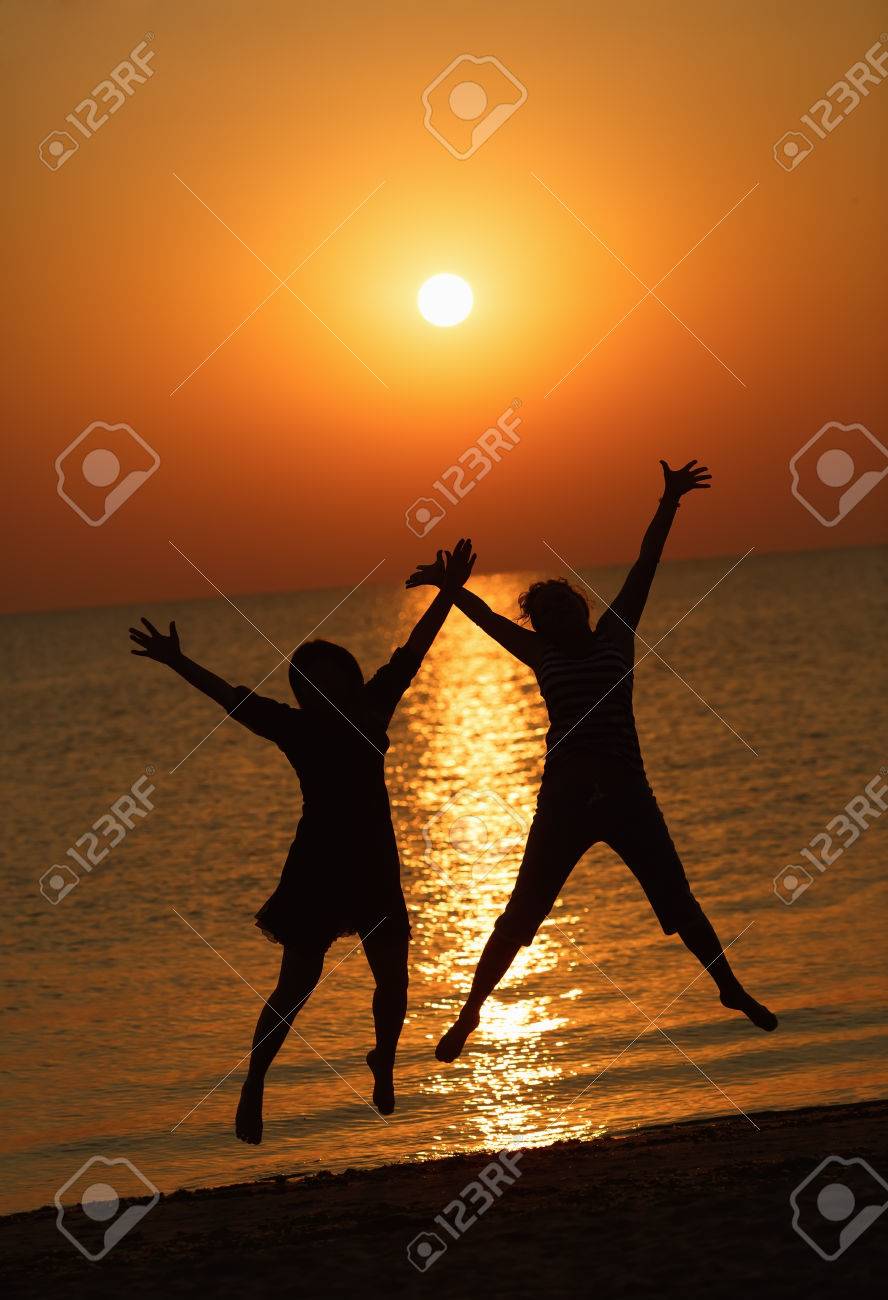 Two Girls Jumping On A Background Of The Rising Sun Over The