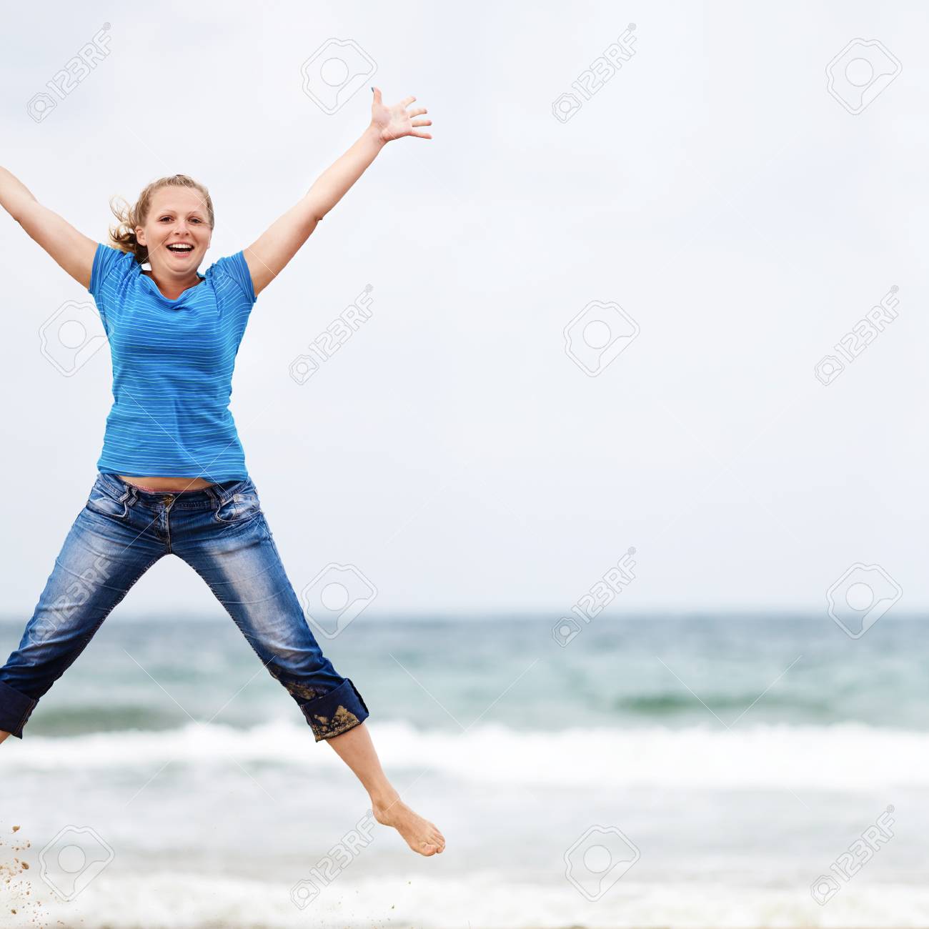 Models Man And Woman Jumping For Joy At Seaside Stock Photo And