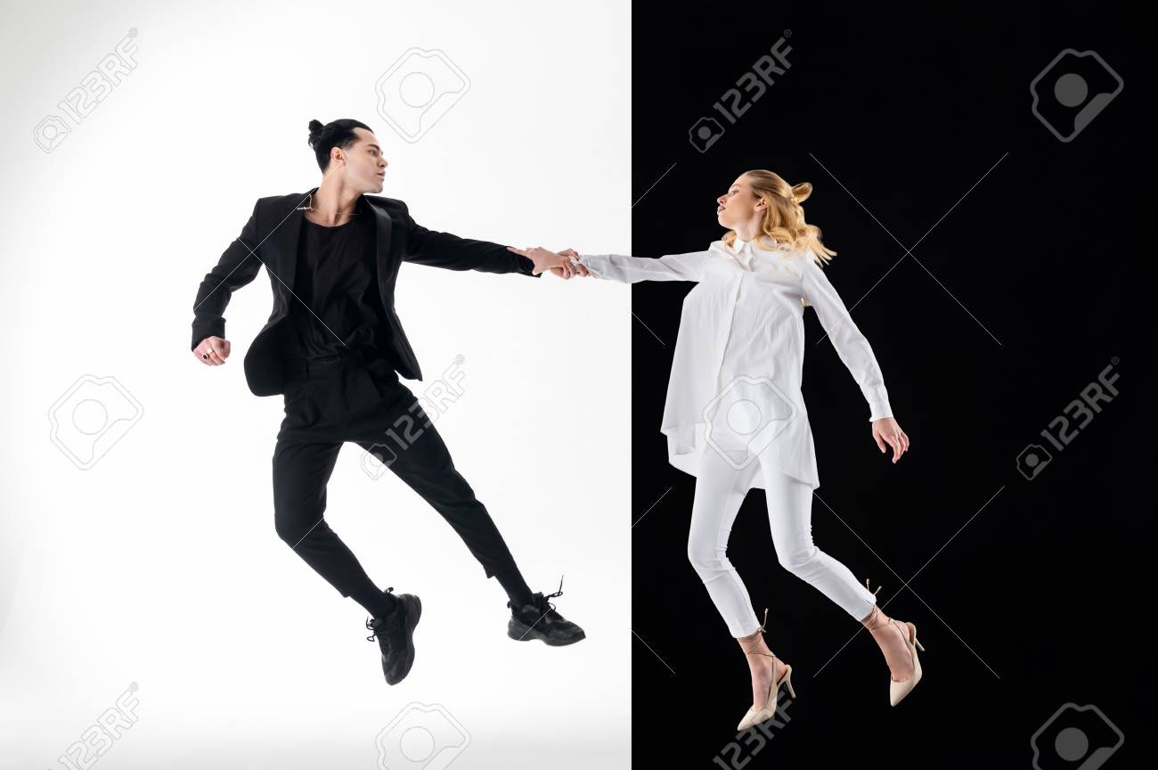 Female And Male Models Jumping With Knees Bent Wearing Pants By