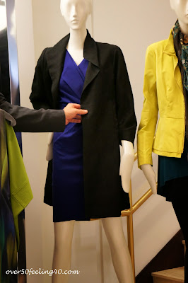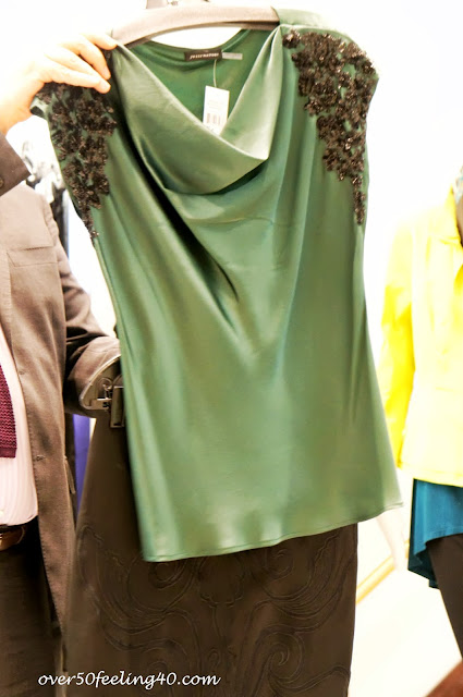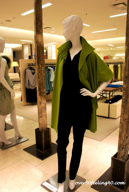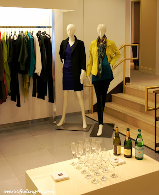 I was invited to come tour the floors with two stylists, discussing fall trends, and what I desired to say to my over 50 friends about their fashion selections this fall. We pulled outfits for two mannequins and a rack of fabulous fall statement pieces. Then they invited me to be a part of the fashion presentation to my friends attending the party. It was so much fun to sit on plush couches in the Theory section of store, sip delectable beverages, and discuss top designs this year!!